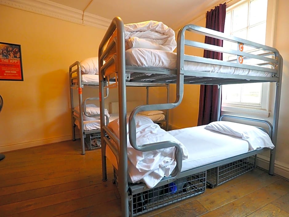 This is a bed in a bright and spacious dormitory with shared external bathroom facilities.